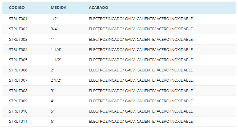 | STRUT001 | 1/2" | ELECTROZINCADO/ GALV. CALIENTE/ ACERO INOXIDABLE |